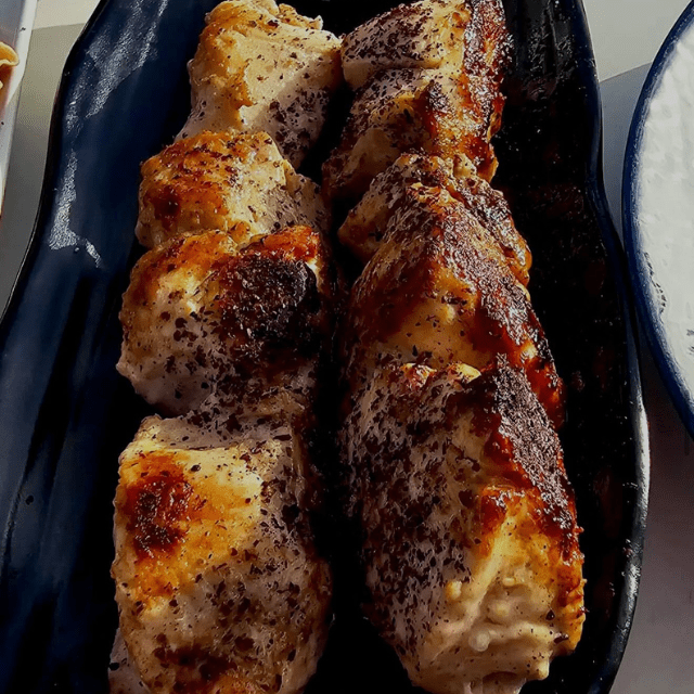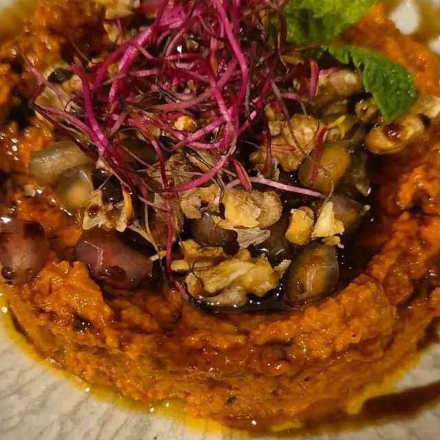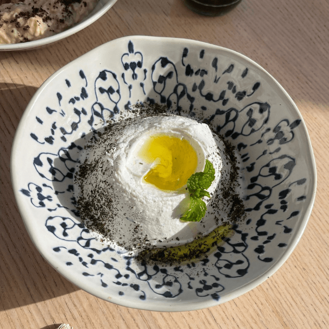 Su carta combina sabores frescos y especiados: hummus cremoso, labneh artesanal, mutabal de berenjena asada, crujientes arayes rellenos y brochetas a la parrilla que conquistan desde el primer bocado. Y para el final, los postres con flor de azahar y pistacho son pura tentación.