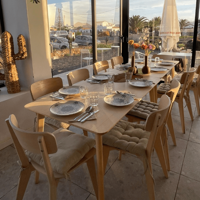 El ambiente es íntimo y acogedor, con una decoración cálida y natural que invita a relajarse. En su terraza exterior, las noches se llenan de encanto, entre luces suaves y la brisa de Lajares.
